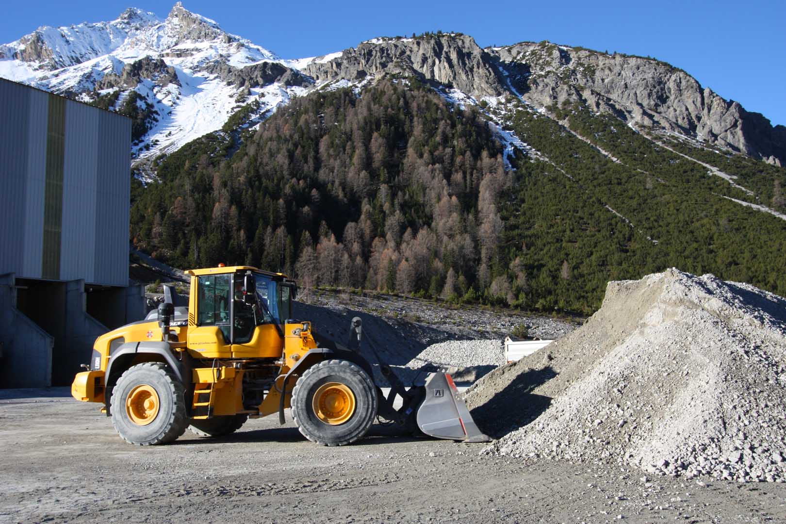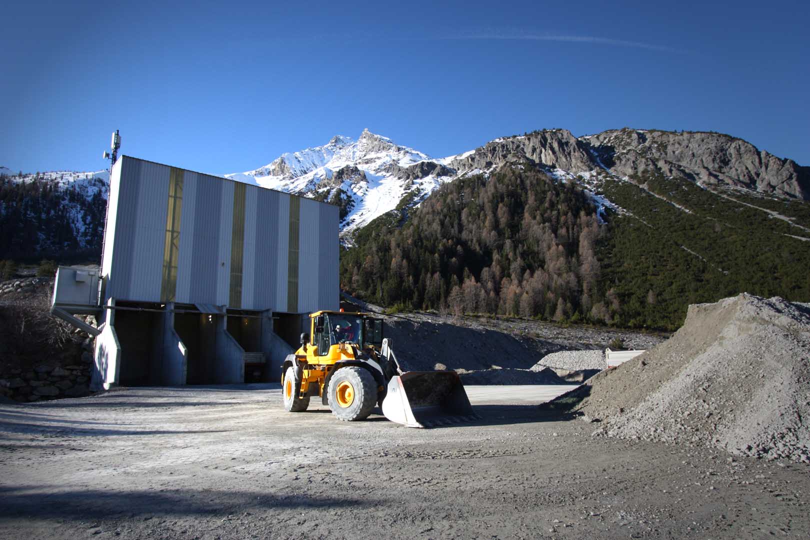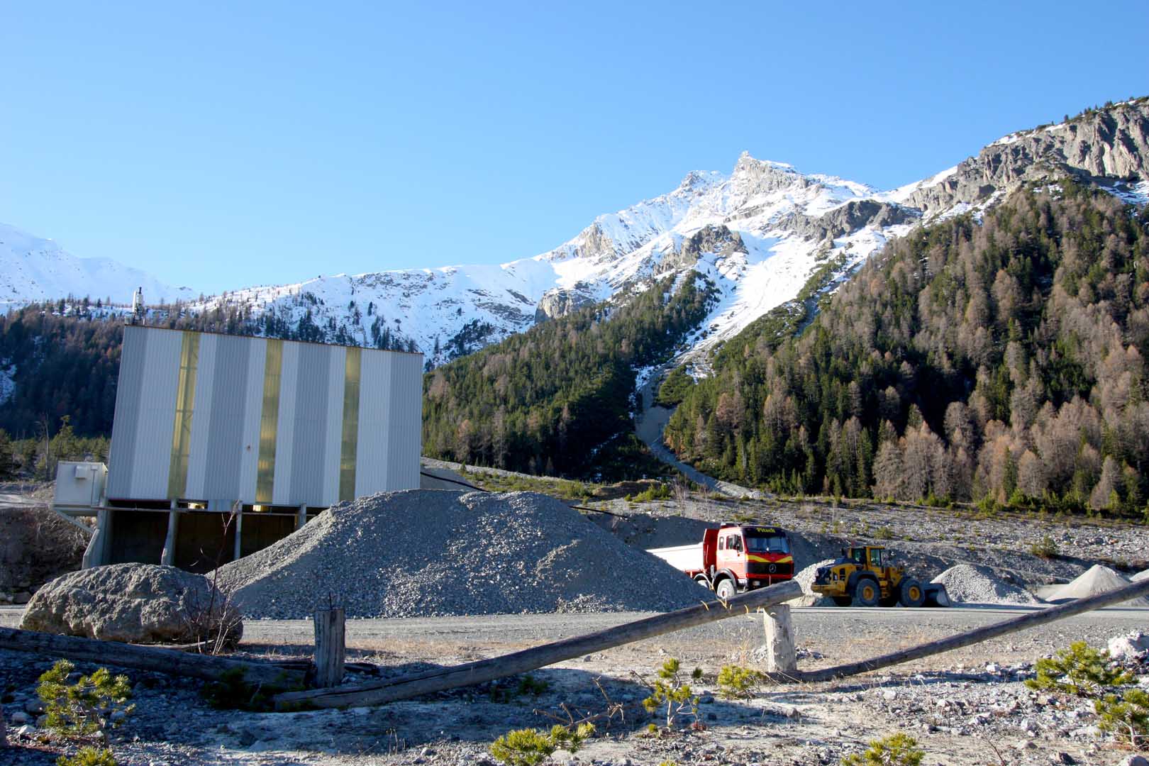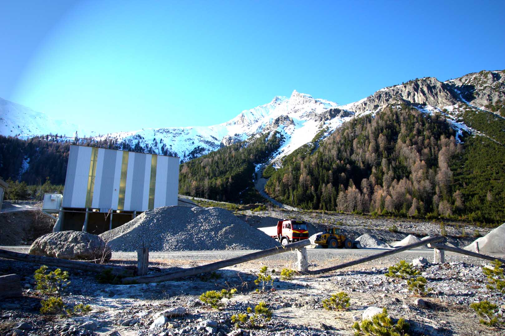 Von dessen natürlicher Erosion gewinnen wir unsere Materialien, die überwiegend im Tal verbleiben und für Strassen- und Bauten eingesetzt werden.